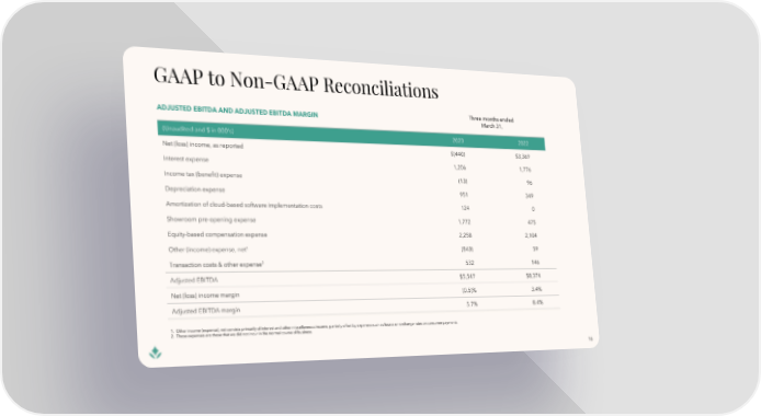 ADJUSTED EBITDA AND ADJUSTED EBITDA MARGIN Three months ended March 31, (Unaudited and $ in 000’s) 2023 2022 Net (loss) income, as reported $(440) $3,369 Interest expense 1,206 1,776 Income tax (benefit) expense (13) 96 Depreciation expense 951 349 Amortization of cloud-based software implementation costs 124 0 Showroom pre-opening expense 1,772 475 Equity-based compensation expense 2,258 2,104 Other (income) expense, net1 (843) 59 Transaction costs & other expense2 532 146 Adjusted EBITDA $5,547 $8,374 Net (loss) income margin (0.5)% 3.4% Adjusted EBITDA margin 5.7% 8.4% 1. Other income (expense), netconsists primarily of interest and other miscellaneous income, partially offset by expenses such as losses on exchange rates on consumer payments. 2. These expenses are those that we did not incur in the normal course of business. 16