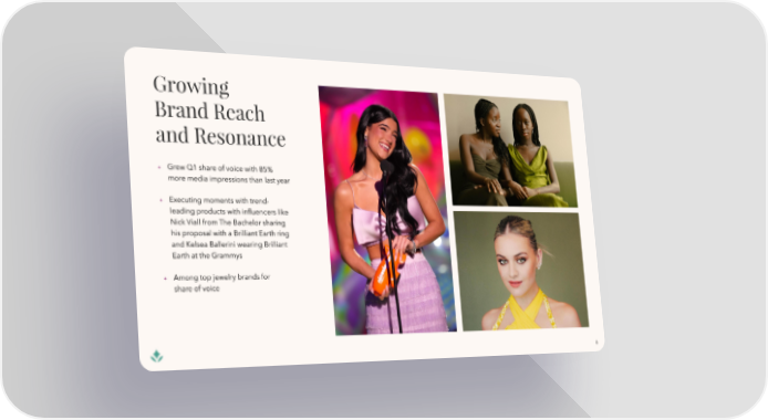 Grew Q1 share of voice with 85% more media impressions than last year Executing moments with trend- leading products with influencers like Nick Viall from The Bachelor sharing his proposal with a Brilliant Earth ring and Kelsea Ballerini wearing Brilliant Earth at the Grammys Among top jewelry brands for share of voice 6
