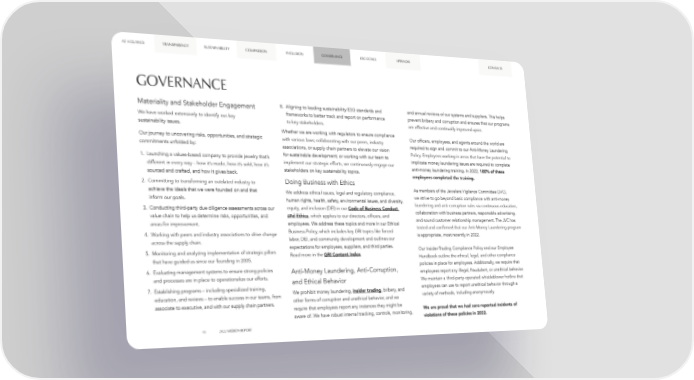 AT A GLANCE TRANSPARENCY SUSTAINABILITY COMPASSION INCLUSION GOVERNANCE ESG GOALS APPENDIX CONTENTS GOVERNANCE Materiality and Stakeholder Engagement 8. Aligning to leading sustainability/ESG standards and and annual reviews of our systems and suppliers. This helps We have worked extensively to identify our key frameworks to better track and report on performance prevent bribery and corruption and ensures that our programs sustainability issues. to key stakeholders. are effective and continually improved upon. Whether we are working with regulators to ensure compliance Our officers, employees, and agents around the world are Our journey to uncovering risks, opportunities, and strategic with various laws; collaborating with our peers, industry commitments unfolded by: associations, or supply chain partners to elevate our vision required to sign and commit to our Anti-Money Laundering for sustainable development; or working with our team to Policy. Employees working in areas that have the potential to 1. Launching a values-based company to provide jewelry that’s implicate money laundering issues are required to complete different in every way – how it’s made, how it’s sold, how it’s implement our strategic efforts, we continuously engage our anti-money laundering training. In 2022, 100% of these sourced and crafted, and how it gives back. stakeholders on key sustainability topics. employees completed the training. 2. Committing to transforming an outdated industry to Doing Business with Ethics achieve the ideals that we were founded on and that We address ethical issues, legal and regulatory compliance, As members of the Jewelers Vigilance Committee (JVC), inform our goals. human rights, health, safety, environmental issues, and diversity, we strive to go beyond basic compliance with anti-money 3. Conducting third-party due diligence assessments across our equity, and inclusion (DEI) in our Code of Business Conduct laundering and anti-corruption rules via continuous education, value chain to help us determine risks, opportunities, and and Ethics, which applies to our directors, officers, and collaboration with business partners, responsible advertising, areas for improvement. employees. We address these topics and more in our Ethical and sound customer relationship management. The JVC has Business Policy, which includes key GRI topics like forced tested and confirmed that our Anti-Money Laundering program 4. Working with peers and industry associations to drive change is appropriate, most recently in 2022. across the supply chain. labor, DEI, and community development and outlines our expectations for employees, suppliers, and third parties. Our Insider-Trading Compliance Policy and our Employee 5. Monitoring and analyzing implementation of strategic pillars Read more in the GRI Content Index. that have guided us since our founding in 2005. Handbook outline the ethical, legal, and other compliance 6. Evaluating management systems to ensure strong policies Anti-Money Laundering, Anti-Corruption, policies in place for employees. Additionally, we require that and processes are in place to operationalize our efforts. employees report any illegal, fraudulent, or unethical behavior. and Ethical Behavior We maintain a third-party-operated whistleblower hotline that 7. Establishing programs – including specialized training, We prohibit money laundering, insider trading, bribery, and employees can use to report unethical behavior through a education, and reviews – to enable success in our teams, from other forms of corruption and unethical behavior, and we variety of methods, including anonymously. associate to executive, and with our supply chain partners. require that employees report any instances they might be aware of. We have robust internal tracking, controls, monitoring, We are proud that we had zero reported incidents of violations of these policies in 2022. 43 2022 MISSION REPORT