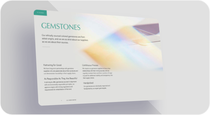 AT A GLANCE GEMSTONES Our ethically sourced colored gemstones are from select origins, and we are as strict about our suppliers as we are about their sources. Partnering for Good Continuous Process We have long-term partnerships with gemstone We require our gemstone suppliers to have close suppliers who are passionate about their products and relationships with their mining sources, and we can demonstrate traceability in their supply chains. regularly evaluate them and their countries of origin to push for additional visibility and transparency into As Responsible As They Are Beautiful their supply chains. In striving to offer gemstones sourced in alignment Handpicked with environmentally responsible principles, we approve origins with mining regulations and Our gemstones are individually inspected and requirements for rehabilitation of the land. handpicked by our expert gemologists. 9 2022 MISSION REPORT