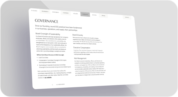AT A GLANCE TRANSPARENCY SUSTAINABILITY COMPASSION INCLUSION GOVERNANCE ESG GOALS APPENDIX CONTENTS GOVERNANCE Since our founding, sound ESG practices have been fundamental in our business, operations, and supply chain partnerships. Board Oversight of Sustainability Board Diversity Our Board of Directors sets high standards for the Company’s We’re proud to have a Board with rich public company employees, officers, and directors while creating value for experience and a deep commitment to and knowledge of our shareholders. Our commitment to sustainability only sustainability. The Board’s diversity reflects the diversity of our strengthened as we went public in 2021 and continued to team members, and most of our Board is female. improve the transparency of our sustainability efforts. Our Board comprises seven members who are committed to Executive Compensation advancing sustainability at Brilliant Earth and playing an A portion of our executives’ bonuses is tied to the Company’s active role in providing strategic oversight and review. performance regarding our ESG Goals so that all executives are Brilliant Earth Board Structure & ESG Oversight working toward the same targets. Audit Committee Risk Management Compensation Committee (Oversight of ESG topics Our Board, executive leadership, officers, and directors are and employee-related matters) constantly monitoring potential risks to our business operations, Nominating & Corporate Governance Committee activities, and supply chain. With our Mission and commitment (Oversight of environmental and governance-related topics) to transparency, traceability, and creating a more socially and environmentally sustainable jewelry industry, ESG topics are a Each committee has its own charter that outlines the natural component of this process. Risks are discussed often and committee’s responsibilities, role, meeting frequency, oversight are categorized by likelihood and severity of impact, with plans of material issues, and other duties. Read the committee put into place to mitigate risks to ensure business continuity. charters on our website. 42 2022 MISSION REPORT
