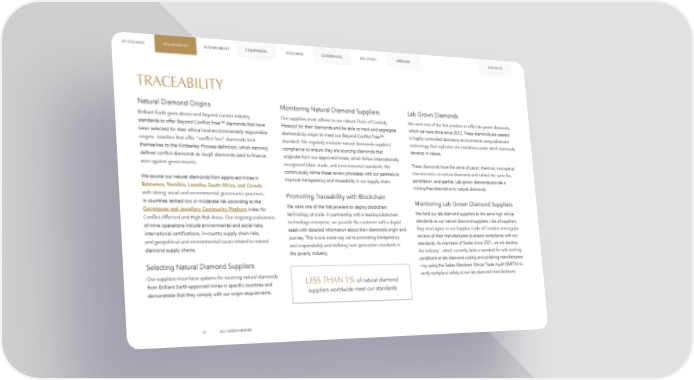 AT A GLANCE TRANSPARENCY SUSTAINABILITY COMPASSION INCLUSION GOVERNANCE ESG GOALS APPENDIX CONTENTS TRACEABILITY Natural Diamond Origins Monitoring Natural Diamond Suppliers Lab Grown Diamonds Brilliant Earth goes above and beyond current industry Our suppliers must adhere to our robust Chain of Custody We were one of the first jewelers to offer lab grown diamonds, standards to offer Beyond Conflict Free™ diamonds that have Protocol for their diamonds and be able to track and segregate which we have done since 2012. These diamonds are created been selected for their ethical and environmentally responsible diamonds by origin to meet our Beyond Conflict Free™ in highly controlled laboratory environments using advanced origins. Jewelers that offer "conflict free" diamonds limit standard. We regularly evaluate natural diamonds suppliers’ technology that replicates the conditions under which diamonds themselves to the Kimberley Process definition, which narrowly compliance to ensure they are sourcing diamonds that develop in nature. defines conflict diamonds as rough diamonds used to finance originate from our approved mines, which follow internationally wars against governments. recognized labor, trade, and environmental standards. We These diamonds have the same physical, chemical, and optical continuously refine these review processes with our partners to characteristics as natural diamonds and exhibit the same fire, We source our natural diamonds from approved mines in improve transparency and traceability in our supply chain. scintillation, and sparkle. Lab grown diamonds provide a Botswana, Namibia, Lesotho, South Africa, and Canada mining-free alternative to natural diamonds. with strong social and environmental governance practices, Promoting Traceability with Blockchain in countries ranked low or moderate risk according to the Monitoring Lab Grown Diamond Suppliers Gemstones and Jewellery Community Platform Index for We were one of the first jewelers to deploy blockchain Conflict-Affected and High-Risk Areas. Our ongoing evaluations technology at scale. In partnership with a leading blockchain We hold our lab diamond suppliers to the same high ethical of mine operations include environmental and social risks, technology enterprise, we provide the customer with a digital standards as our natural diamond suppliers. Like all suppliers, international certifications, in-country supply chain risks, asset with detailed information about their diamond’s origin and they must agree to our Supplier Code of Conduct and regular and geopolitical and environmental issues related to natural journey. This is one more way we’re promoting transparency reviews of their manufacturers to ensure compliance with our diamond supply chains. and responsibility and defining next-generation standards in standards. As members of Sedex since 2021, we are leading the jewelry industry. the industry – which currently lacks a standard for safe working Selecting Natural Diamond Suppliers conditions at lab diamond cutting and polishing manufacturers – by using the Sedex Members Ethical Trade Audit (SMETA) to Our suppliers must have systems for sourcing natural diamonds LESS THAN 1% of natural diamond verify workplace safety at our lab diamond manufacturers. from Brilliant Earth-approved mines in specific countries and demonstrate that they comply with our origin requirements. suppliers worldwide meet our standards 20 2022 MISSION REPORT