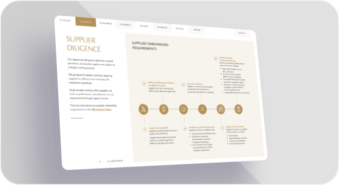 AT A GLANCE TRANSPARENCY SUSTAINABILITY COMPASSION INCLUSION GOVERNANCE ESG GOALS APPENDIX CONTENTS SUPPLIER SUPPLIER ONBOARDING DILIGENCE REQUIREMENTS 06 Independent Social Compliance Monitoring Diamond and jewelry suppliers provide Our natural and lab grown diamond, colored proof of one of the following: gemstone, and jewelry suppliers are subject to Responsible Jewellery Council a diligent vetting process. (RJC) certification DTC Best Practice Principles (BPP) Assurance Programme We go beyond industry norms by requiring Forevermark Management System suppliers to adhere to our sourcing and Certification Assessment Report compliance standards. 02 Affidavit of Management Systems 04 Know Your Customer Association of Professional Social and Material Tracking Supplier is vetted and cleared against Compliance Auditors (APSCA) Supplier commits to maintaining a government lists of denied and Social Compliance Audit Once we start working with a supplier, we Brilliant Earth-approved supply chain. sanctioned individuals and companies. Sustainability Rated Diamond (SCS-007) track its performance and adherence to our requirements through regular reviews. Find out more about our supplier onboarding requirements in the GRI Content Index. 01 Supplier Sourcing Model 03 Anti-Money Laundering Agreement 05 Supplier Code of Conduct Supplier provides business model and Supplier confirms its compliance with: Supplier commits to our Supplier supply chain information. Vendor Identification Requirements Code of Conduct, including: Supplier demonstrates documented Anti-Money Laundering Human rights product or material origins from (AML) Business Transaction Responsible labor practices Brilliant Earth-approved sources. Compliance Agreement Community development Anti-Corruption and Foreign Environmental practices Corrupt Practices Act (FCPA) Compliance Agreement 18 2022 MISSION REPORT