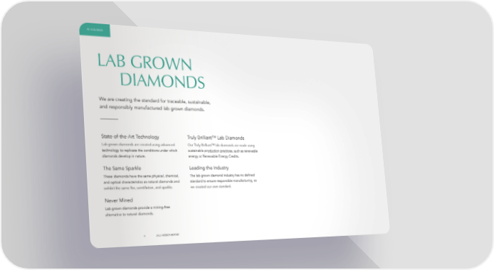 AT A GLANCE LAB GROWN DIAMONDS We are creating the standard for traceable, sustainable, and responsibly manufactured lab grown diamonds. State-of-the-Art Technology Truly Brilliantâ„¢ Lab Diamonds Lab grown diamonds are created using advanced Our Truly Brilliantâ„¢ lab diamonds are made using technology to replicate the conditions under which sustainable production practices, such as renewable diamonds develop in nature. energy or Renewable Energy Credits. The Same Sparkle Leading the Industry These diamonds have the same physical, chemical, The lab grown diamond industry has no defined and optical characteristics as natural diamonds and standard to ensure responsible manufacturing, so exhibit the same fire, scintillation, and sparkle. we created our own standard. Never Mined Lab grown diamonds provide a mining-free alternative to natural diamonds. 8 2022 MISSION REPORT