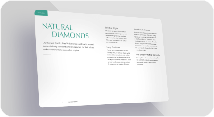 AT A GLANCE Selective Origins Blockchain Technology NATURAL We source our natural diamonds from Blockchain technology automates traceability approved mines with strong social and across the global supply chain, from mining environmental governance practices operator to the ultimate end consumer, with DIAMONDS in Botswana, Namibia, Lesotho, South a digital asset detailing information about Africa, and Canada, which are ranked the diamond’s origin and journey. This is the low or moderate risk. future of supply chain traceability and is an Our Beyond Conflict Free™ diamonds continue to exceed investment we are proud to make and grow. current industry standards and are selected for their ethical Living Our Values We currently offer thousands of blockchain- The day after Russia invaded Ukraine in enabled diamonds. and environmentally responsible origins. February 2022, we removed Russian-origin diamonds from our website even as they Truly Brilliant™ Natural Diamonds continued to be bought and sold globally. Our Truly Brilliant™ natural diamond suppliers We’re proud of the fast and decisive action use sustainable production practices, such we took to help ensure that our products as renewable energy or green building do not support the invasion of Ukraine. construction. 7 2022 MISSION REPORT