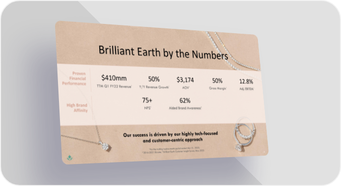 Brilliant Earth by the Numbers Proven $410mm 50% $3,174 50% 12.8% Financial Performance 1 1 1 1 1 TTM Q1 FY22 Revenue Y/Y Revenue Growth AOV Gross Margin Adj. EBITDA High Brand 75+ 62% Affinity NPS2 Aided Brand Awareness3 Our success is driven by our highly tech-focused and customer-centric approach 1 For the trailing twelve-month period ended Mar 31, 2022; 2 3 2016-2021 Bizrate; Brilliant Earth Customer Insight Survey May 2022 5